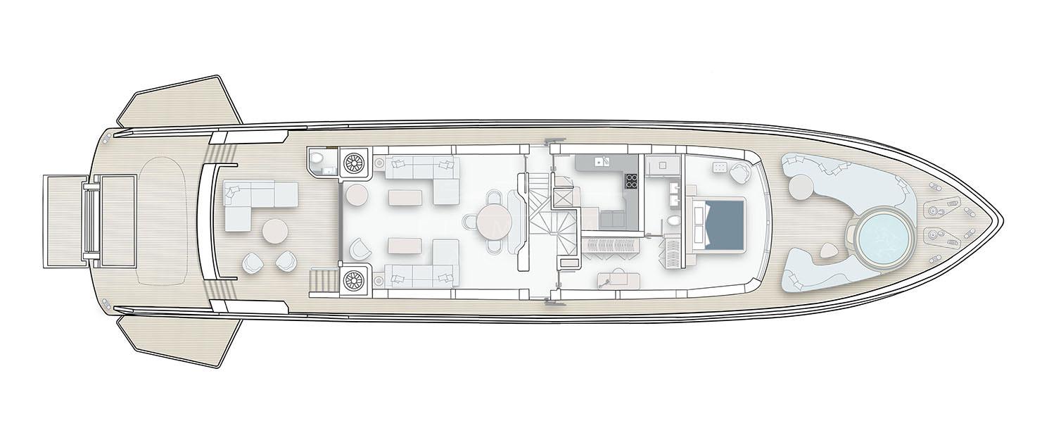 Sirena Superyachts is excited and proud to introduce our latest model, the Sirena 118. This new launch will feature naval architecture by Germán Frers, interior design by Cor D. Rover, and exterior styling by Sirena’s inhouse design team. This collaboration has resulted in a yacht that promises to evolve onboard features and find a balance between elegance and comfort. The challenge, of course, is to augment the Sirena brand promise, and carry its strength and unifying characteristics throughout the entirety of an even larger design. We think Sirena enthusiasts will be pleasantly surprised. The yacht will welcome large groups of family and friends but still have the intimate feel that helped Sirena Yachts make its name. Proportionally appealing spaces are situated both indoors and out, and have comfortable lines of sight and consistent headroom. As all Sirena Yachts do, the Sirena 118 uses a combination of natural and artificial light creatively and generously. Every enclosed deck on the yacht fulfills the brand promise by offering enormous windows that provide the best views of the yacht’s surroundings, while light fixtures are designed to set the right ambiance for any gathering. While at anchor, the yacht deploys folding wings to expand the deck space aft, while a hydraulic platform serves as a launchpad for waterborne adventures on a tender or other water toys. The entire space is tailored for family and friends to enjoy a multilevel area for full enjoyment of the surrounding sea.